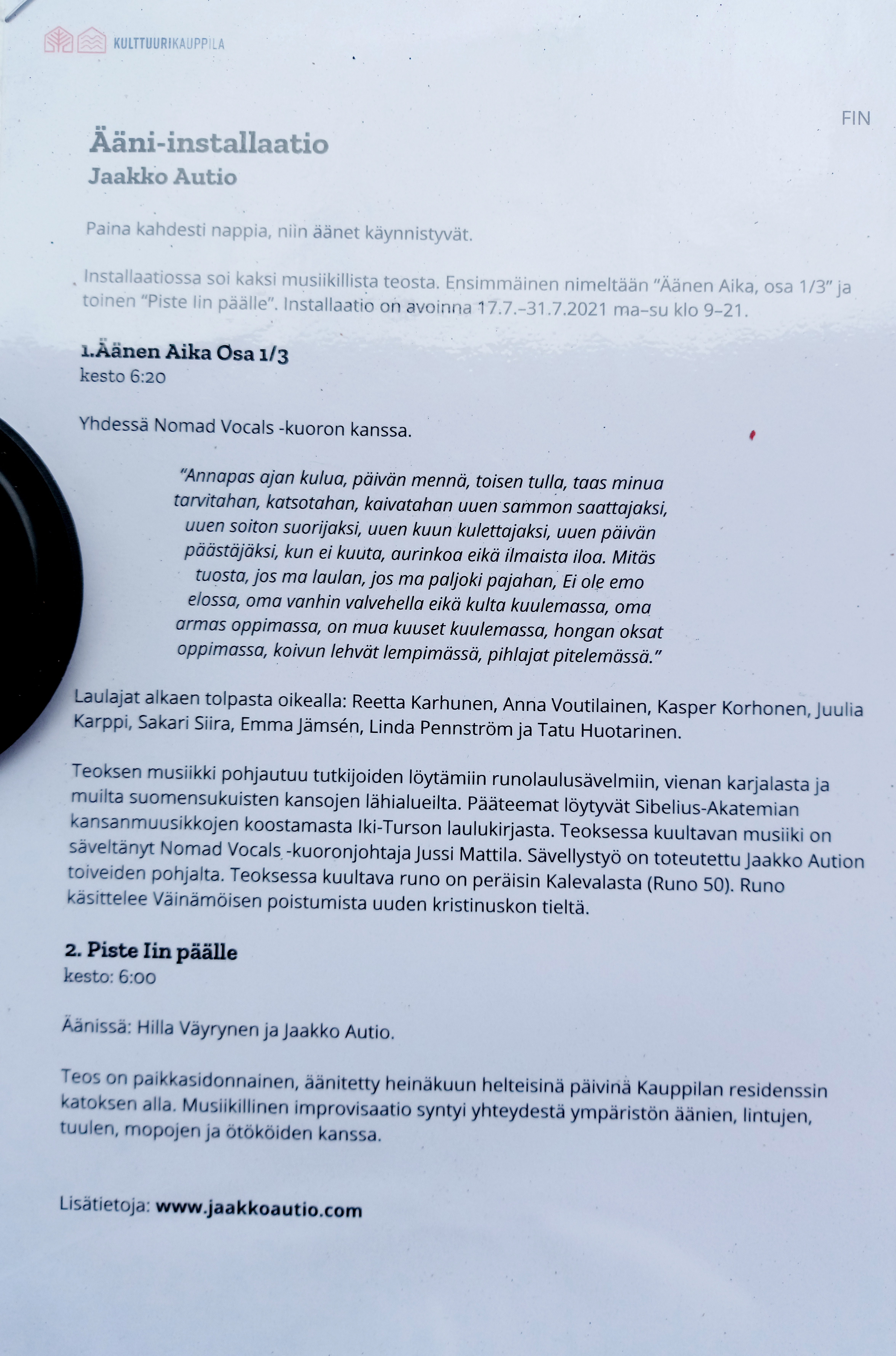 Traditional Finnish Kalevala influenced work “As Time Sounds, Chapter one”. The latter “Dot the i’s” is a site-specific improvisation by Jaakko Autio and Hilla Väyrynen. The song takes place against existing fTraditional Finnish Kalevala influenced work “As Time Sounds, Chapter one”. The latter “Dot the i’s” is a site-specific improvisation by Jaakko Autio and Hilla Väyrynen. The song takes place against existing forces: the wind, the birdsnest, the rumble of motorbikes and the rumble of mutual interpersonal space. The eight channel sound installation starts by pressing the big button at the Gallerys yard canopy.
