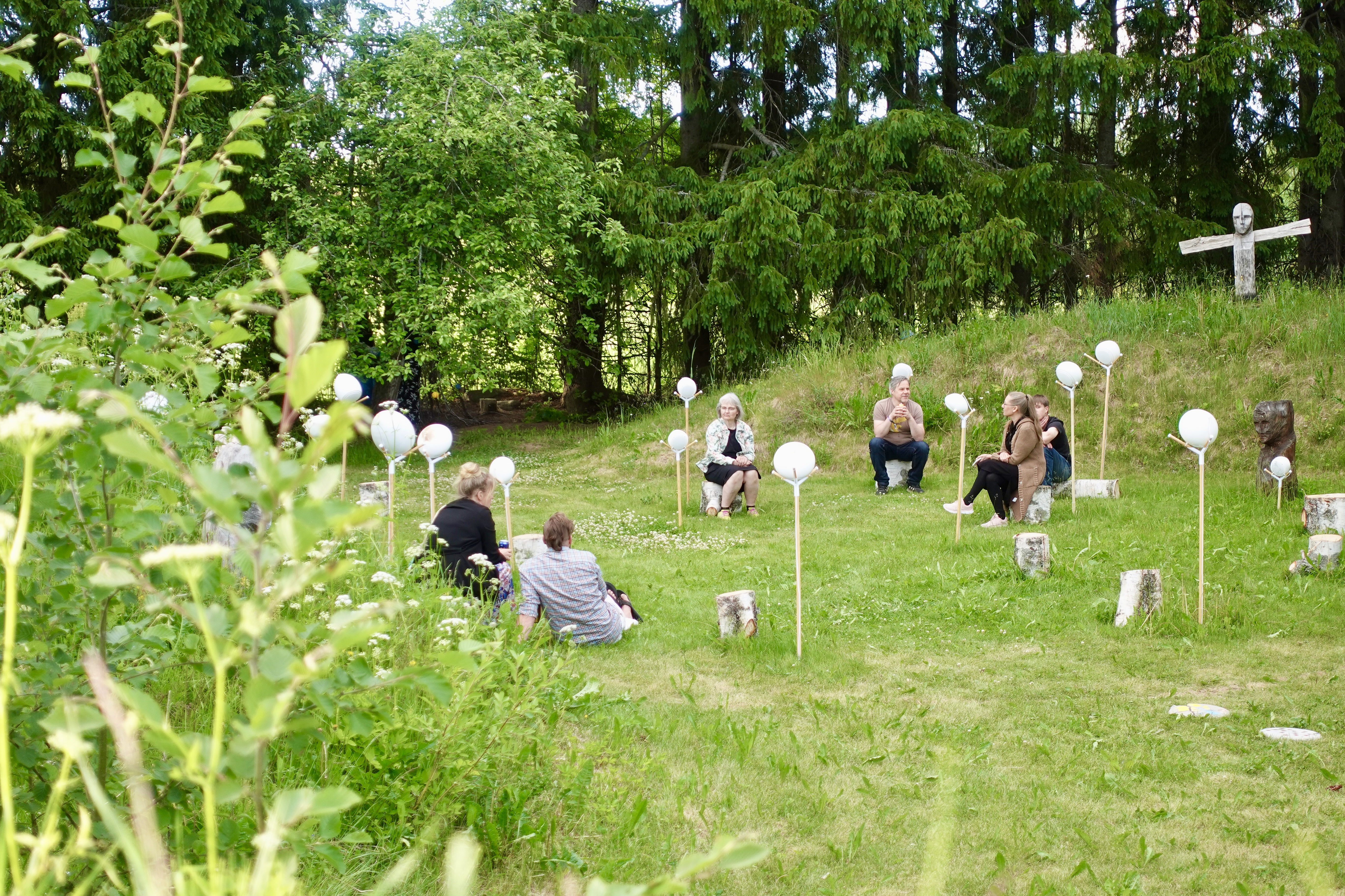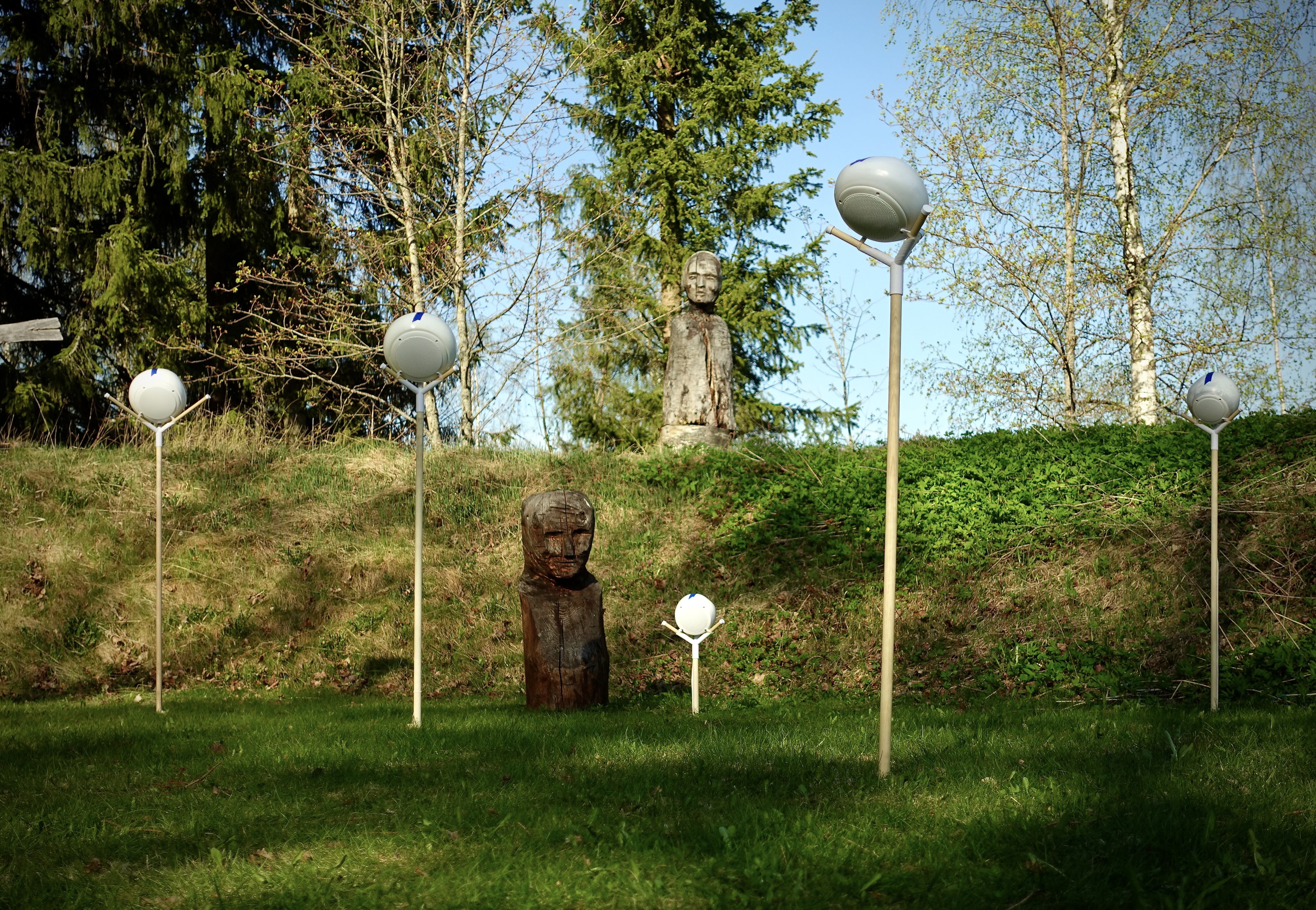 Harmony in Displacement is presented as a site-specific outdoor installation. Twenty uniquely designed speakers are placed around the Haihatus Art Centre’s yard. Each singer’s voice resonates from its own distinct point in space, inviting visitors to move freely, pause, and choose their listening perspective. The natural environment – the presence of field, trees, bird song, and open air – blends seamlessly with the recorded voices, deepening the sense of connection and contemplation. This spatial arrangement highlights the values of radical empathy, safety, and shared humanity that are central to the work.