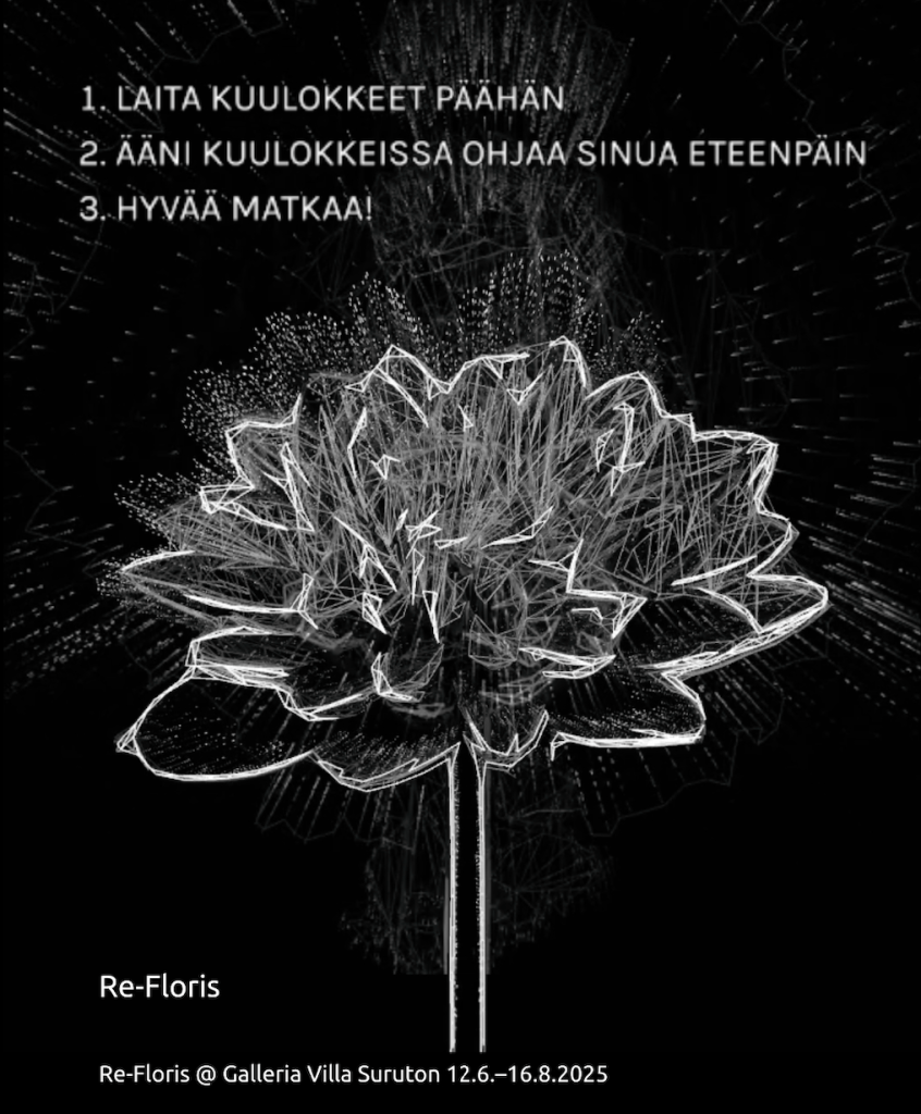 Re-Floris is a site-specific sound work by Jaakko Autio, presented at the Villa Suruton summer exhibition in Savonlinna. The piece is based on the idea of renewed blossoming and the importance of space in the experience of art. The composition is by Anna Voutilainen-Veijonen. The work is performed by the Sawotta Choir, with 20 singers from the Savonia region. Guest vocalists are Kasper Omenasaari and Reetta Karhunen. The saxophone is played by Anna Voutilainen-Veijonen, and the narration is read by Hilla Väyrynen.