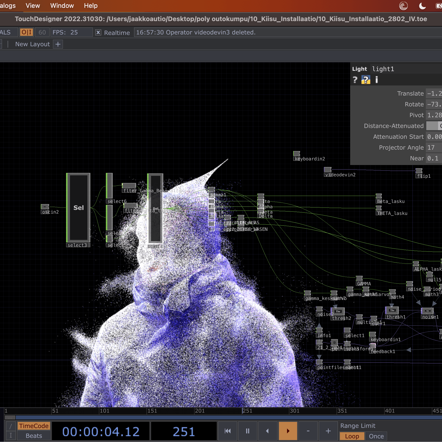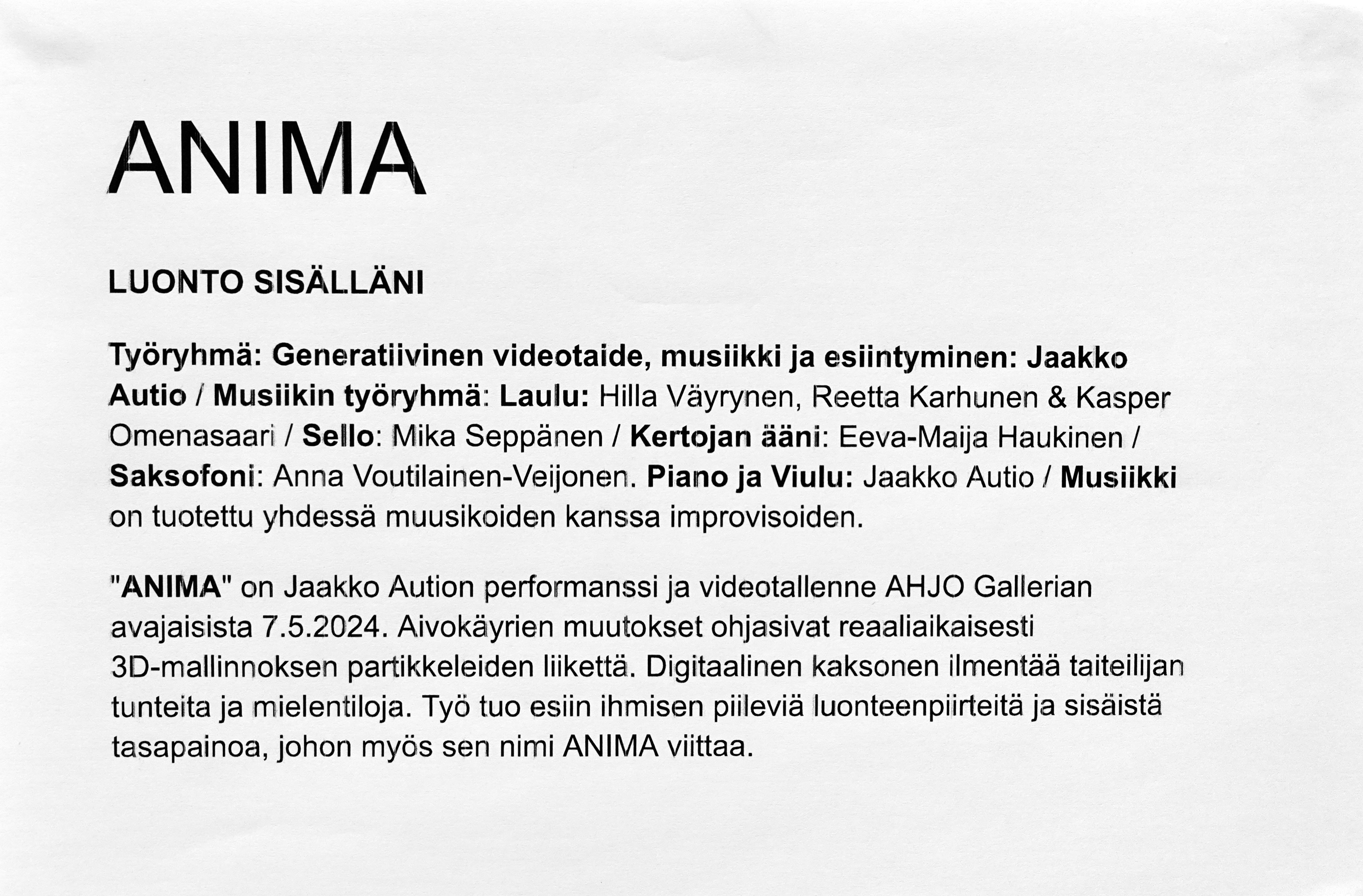 “ANIMA” is Jaakko Autio’s performance and video installation, recorded on May 8th at the AHJO Gallery opening as part of the URBANA HORTUS partnership exhibition in Joensuu. The piece combines Autio’s live meditation and brainwave digital synesthesia, where changes in brainwaves dynamically control the movement of particles in a 3D model projected on the gallery wall. The digital twin embodies subtle changes in the artist’s emotions, mind, and consciousness. The work highlights latent human characteristics and inner balance, to which its name “ANIMA” also refers.