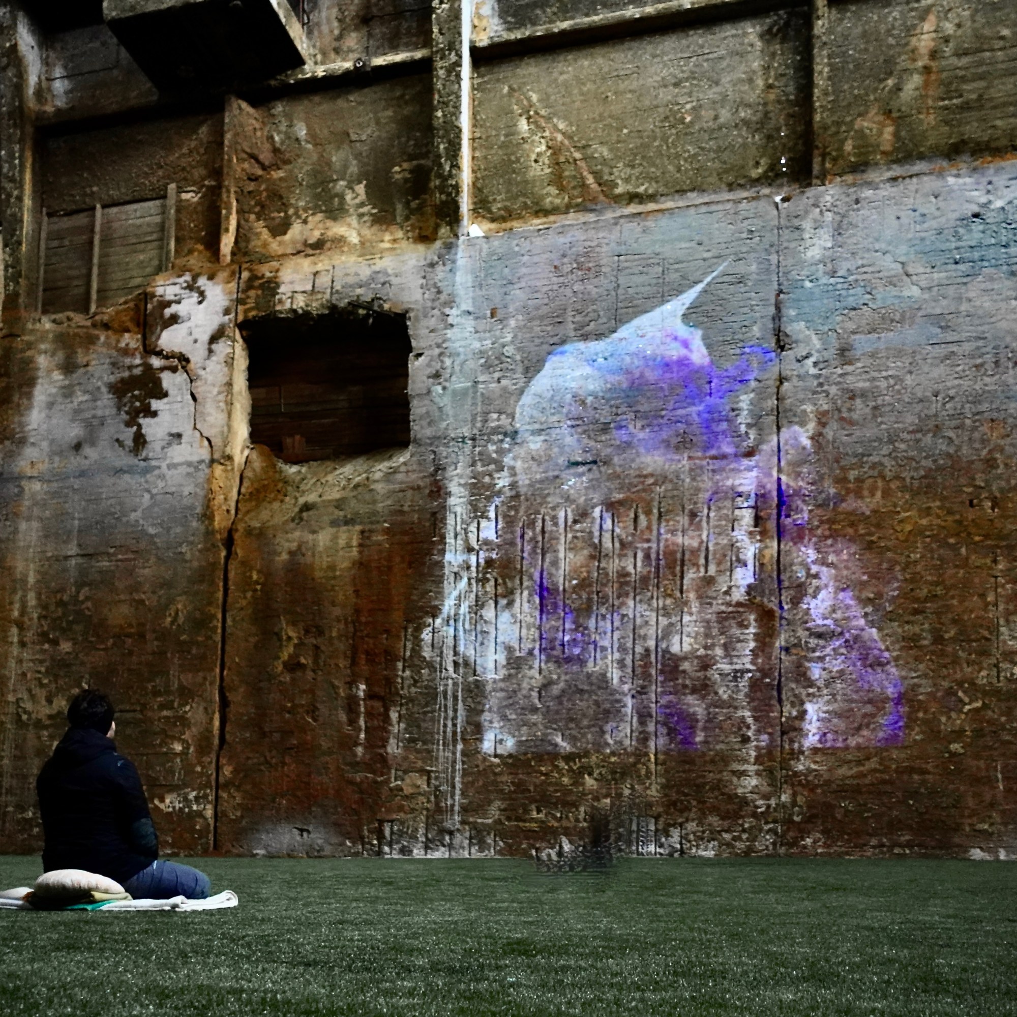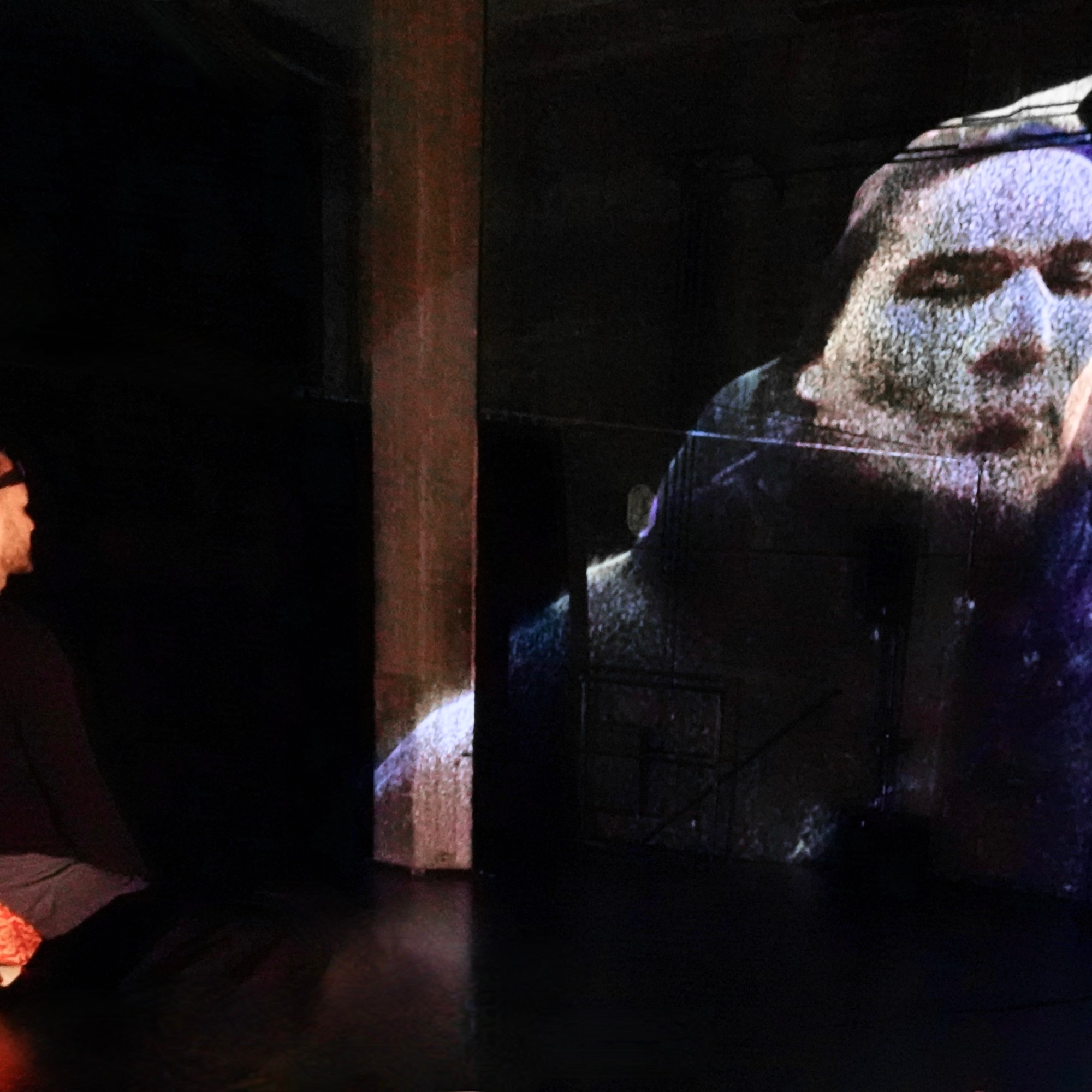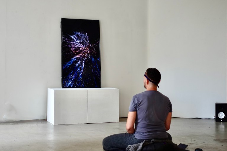 In the large theatre hall of Valve, an intimate setting emerges: two cushions placed at the center — one for the artist, one for the visitor. The participant wears an EEG sensor that reads real-time brainwave data and translates it into a generative video projection. This living image mirrors emotional and mental states — empathy, focus, and embodied presence form distinct visual patterns.