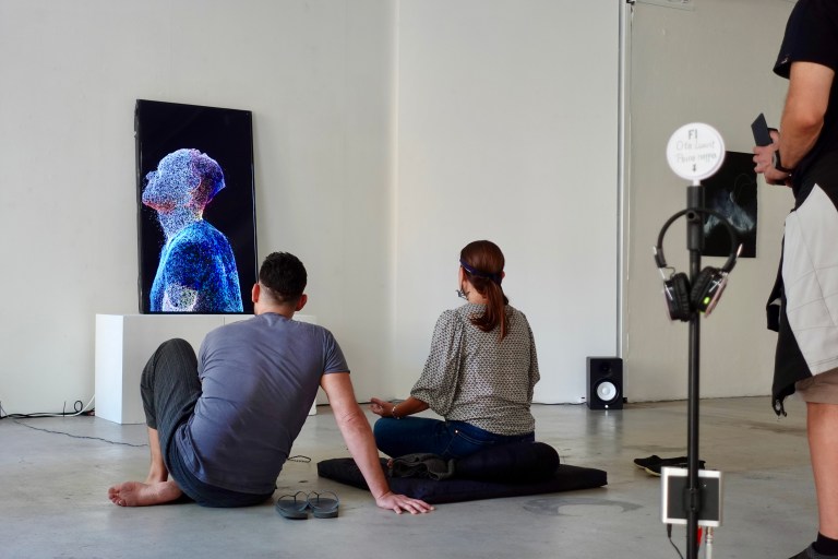 Jaakko Autio’s work for this exhibition focuses on this theme through an interactive multimedia installation and a storytelling level designed specifically for this exhibition. Autio is meditating on a cushion wearing an EEG-reader, and his meditation (emotions and focus of intention) are represented as a digital double on the screen in the gallery space. Through this work Autio seeks to question assumptions of otherness in a gentle way and aims to dismantle invisible boundaries between artist and viewer, between subject and object.